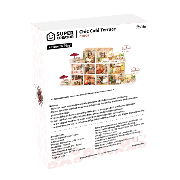 The Terrace Extension Pack is designed to connect with your Rolife Super Creator rooms. Just snap it on to expand a cozy balcony or a cute café corner. Whether you want a sunny spot to relax or a stylish space to hang out, this pack helps you build the lifestyle you love in miniature.