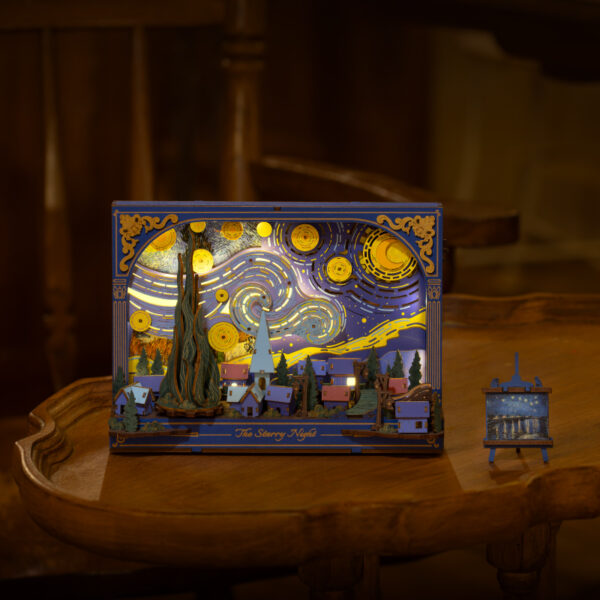 The Rowood Starry Night 3D wooden puzzle presents a landscape view of peaceful twilight from a different perspective. The giant clouds swirl and blend with the sky above a quiet, sleeping village, while playful elements, such as the gear-driven stars and moon, a rotatable cypress tree, and a wagon wheel, complete this wooden diorama kit. It’s an adaptable desk decoration with a changeable background to give you a fresh view. And its final touch is the gentle breathing light behind the scene, adding a warm glow to the already enchanting night light puzzle and making your rooms more magical. This desk decoration will light up your nights and add more color to your daily life.