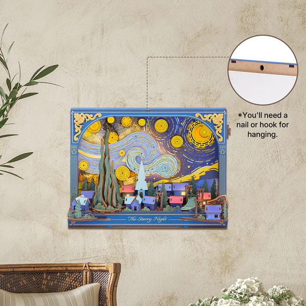 Interact with this classic masterpiece through Rowood’s The Starry Night. With colorful, movable elements and a built-in night light, this wooden puzzle kit transforms into a classic shelf and wall decoration.